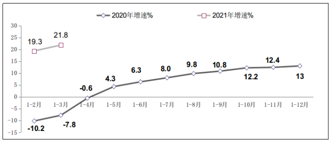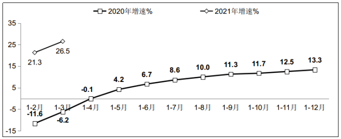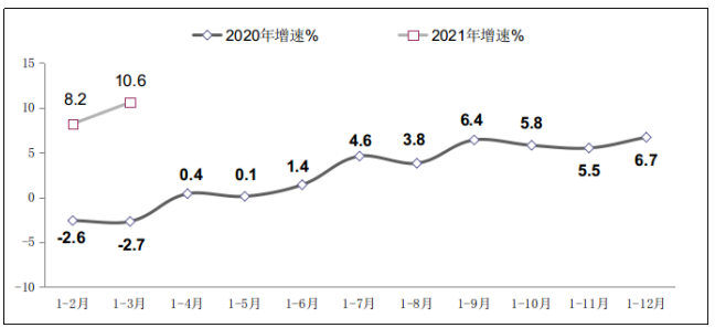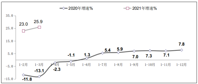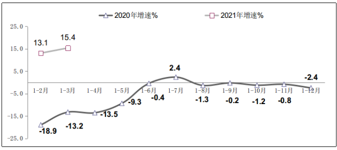 图2 2020年-2021年一季度软件业利润总额增长情况