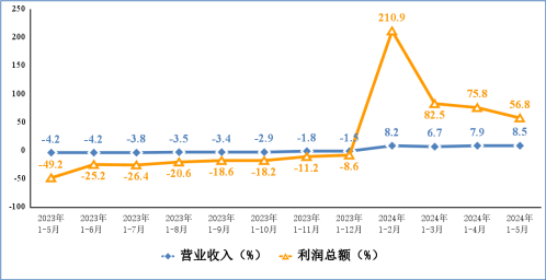 1-5月,规模以上电子信息制造业实现营业收入5.95万亿元,同比增长8.5%,较1-4月提高0.6个百分点;营业成本5.22万亿元,同比增长7.9%;实现利润总额1946亿元,同比增长56.8%;营业收入利润率为3.3%,较1-4月增加0.2个百分点。5月份,规模以上电子信息制造业营业收入1.28万亿元,同比增长10.8%。