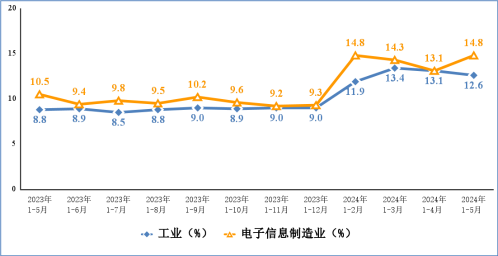 1-5月,规模以上电子信息制造业增加值同比增长13.8%,增速分别比同期工业、高技术制造业高7.6个和5.1个百分点。5月份,规模以上电子信息制造业增加值同比增长14.5%。
