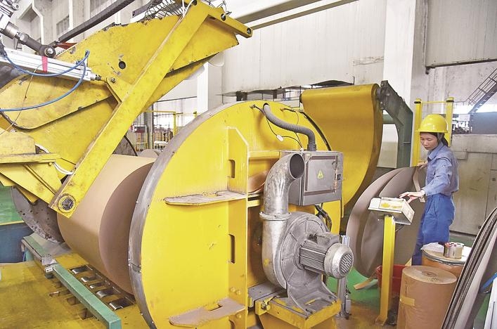 连日来,青山纸业股份有限公司造纸二厂车间,工人正加紧生产牛皮伸性纸。