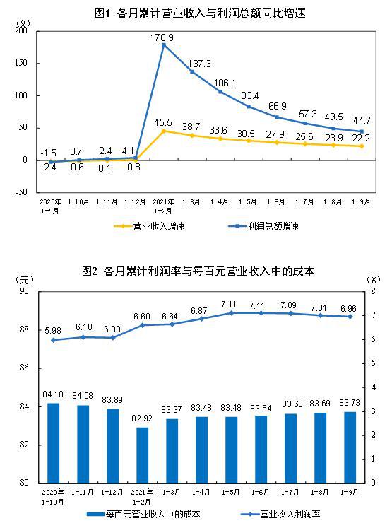 数据显示,1-9月份,全国规模以上工业企业利润同比增长44.7%,两年平均增长18.8%。三季度,工业企业利润同比增长14.3%,继续保持两位数增长;两年平均增长15.1%,增速比二季度略有回落,总体保持良好增势。其中,9月份利润同比增长16.3%,增速较上月加快6.2个百分点。