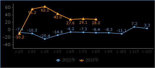 (三)网络销售领域企业收入高速增长。1—8月份,主要提供网络销售服务的企业(包括大宗商品、农副产品、综合电商、医疗用品、快递等)互联网业务收入同比增长45.1%。