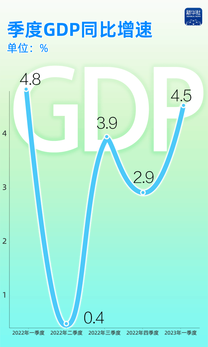 有数为证:2022年至今,我国的季度GDP同比增速分别为4.8%、0.4%、3.9%、2.9%和4.5%,一季度GDP增速达到了2022年二季度以来最高水平。